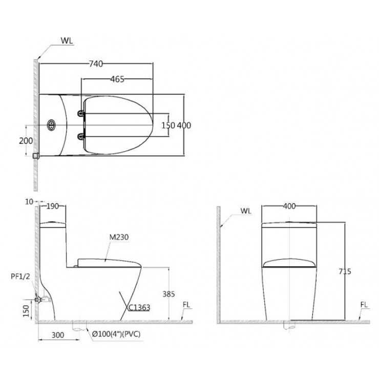Bản vẽ kỹ thuật bồn cầu 1 khối nắp điện tử Caesar C1363F + TAF400H (CD1363+TAF400H)