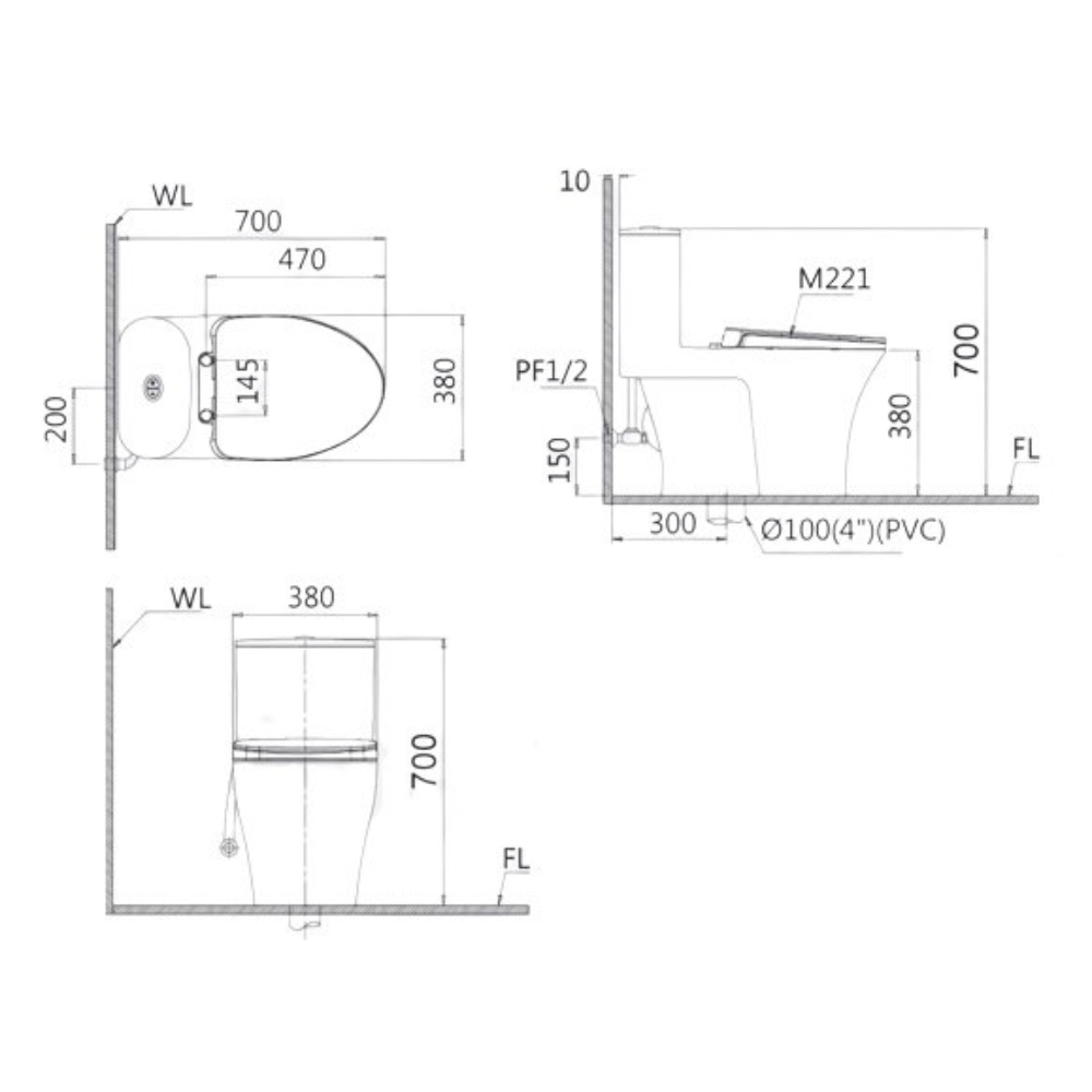Bản vẽ kỹ thuật bồn cầu 1 khối nắp điện tử Caesar C1395F + TAF610H
