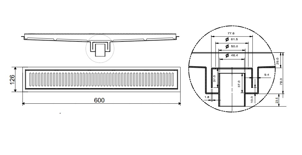 - Kích thước: 600 x 126 mm. Phễu lớn, thoát nước nhanh chóng, ngăn mùi và côn trùng hiệu quả